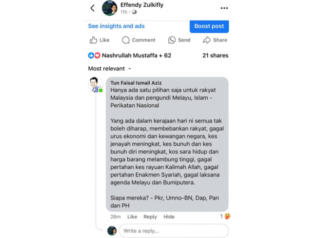Komen itu tertulis bahawa Perikatan Nasional satu-satunya pilihan yang ada ketika ini untuk pengundi Melayu-Islam kerana semua jemaah menteri di dalam kerajaan dianggap “tidak boleh diharap, membebankan rakyat, gagal urus ekonomi dan negara, kes jenayah meningkat, kos sara hidup dan harga barang melambung tinggi”.
