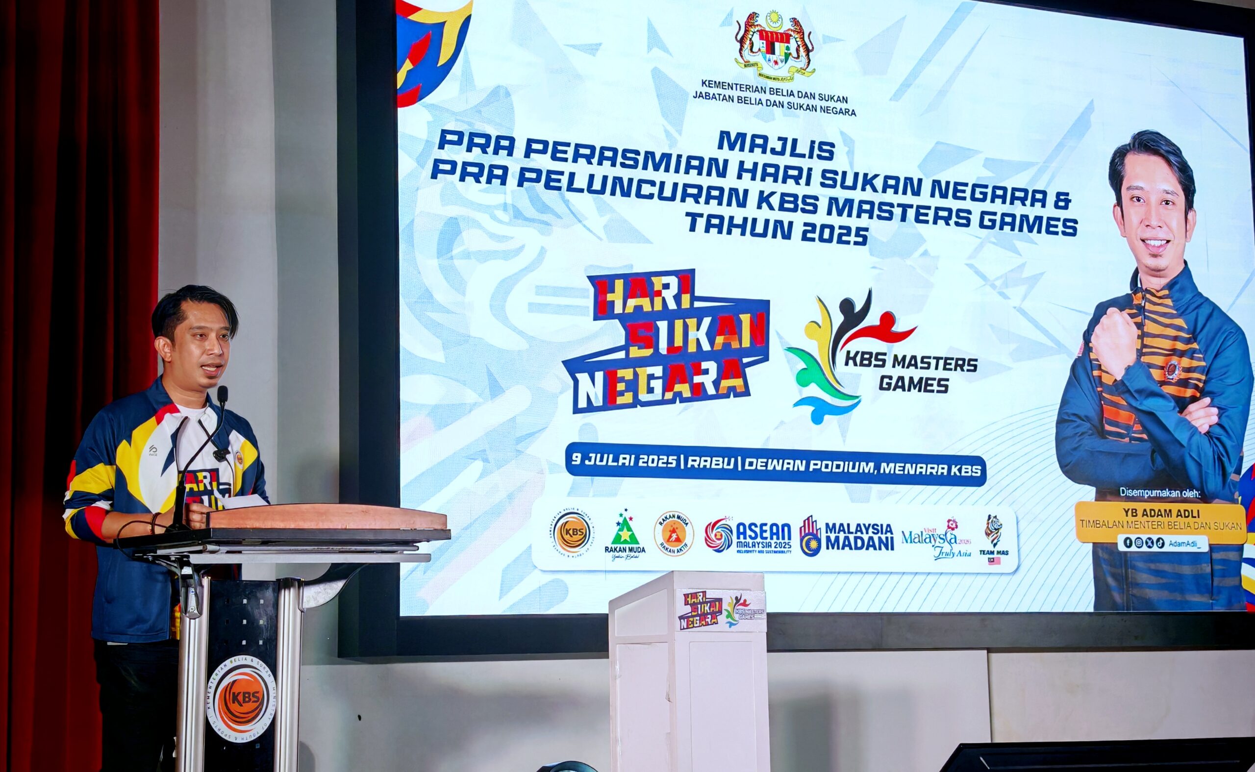 Timbalan Menteri Belia dan Sukan, YB Adam Adli, hari ini menyempurnakan Majlis Praperasmian Hari Sukan Negara 2025 (HSN2025) dan Prapeluncuran KBS Masters Games 2025, sebagai simbolik permulaan kepada sambutan sukan kebangsaan terbesar negara yang bakal berlangsung Oktober ini.