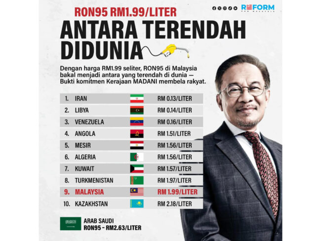 Penetapan harga RM1.99 seliter bagi RON95 merupakan satu bukti komitmen Kerajaan MADANI dalam membela kebajikan rakyat.