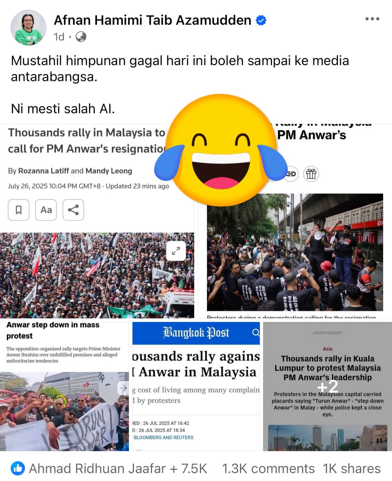 Lihat hantaran Facebook Afnan Hamimi, Ketua Pemuda Pas Pusat dan Eric See-To atau Lim Sian See yang bangga program Himpunan Turun Anwar dapat liputan antarabangsa kerana berjaya memburukakn imej PMX.