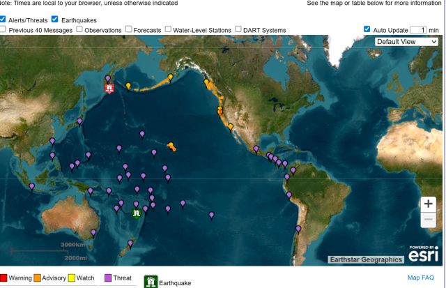 Amaran tsunami pada masa ini berkuat kuasa untuk Hawaii dan sebahagian pantai California Utara.