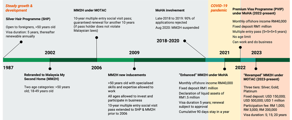 The MM2H is a long-term, renewable multiple-entry social visit pass allowing the participant and their dependents to reside in Malaysia. It was rebranded in 2002 from its predecessor, the Silver Hair Programme (SHP) established in 1987 under the purview of Malaysia’s Immigration Department. From 2002 to 2019, the MM2H underwent a period of growth, especially from 2006, when it was transferred to the Ministry of Tourism, Arts and Culture’s (MOTAC) management .