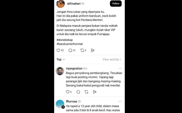 “Cakap macam orang tiada pegangan agama. Kesalahan rogol bawah umur adalah jenayah yang amat hina. Di penjara sekalipun ia dianggap paling tercela. Jangan anggap perbuatan itu sebagai sesuatu yang hebat,” tegas pengguna Threads, Aisyah Rehman.
