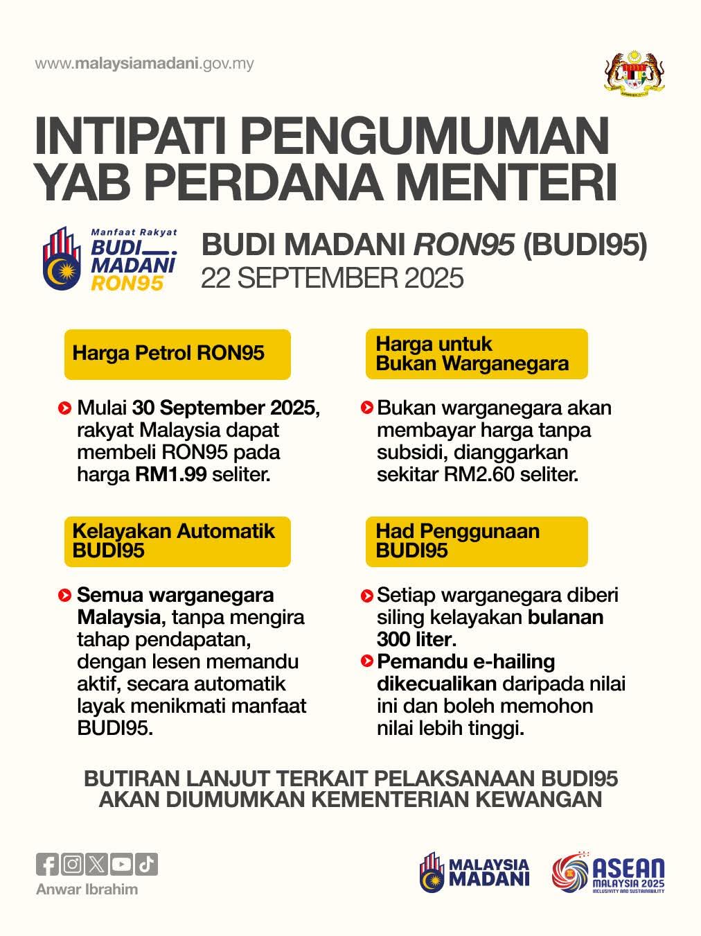 Semalam Anwar mengumumkan pelaksanaan petrol RON95 pada harga RM1.99 berbanding RM2.05 seliter bermula 30 September ini bagi rakyat tempatan tanpa mengambil kira tahap pendapatan.