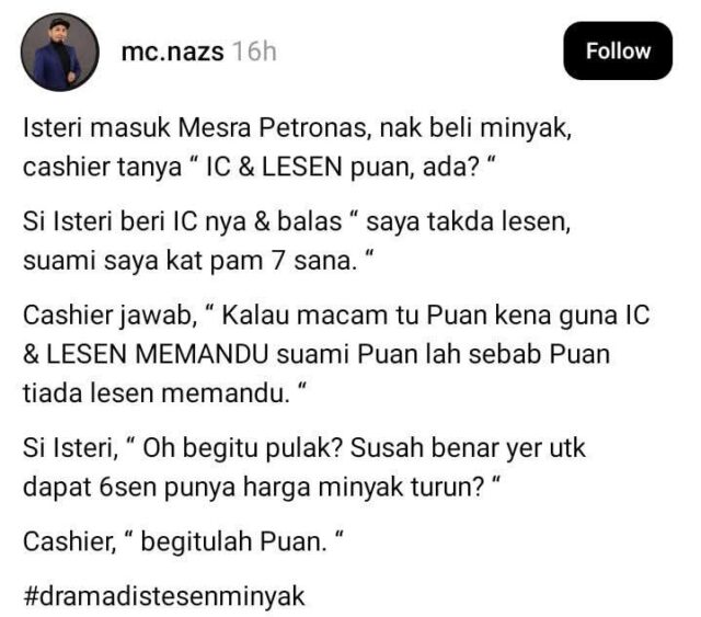 Menerusi catatan dengan tanda pagar “drama di stesen minyak” itu, dia menggambarkan situasi si isteri yang diminta menunjukkan kad pengenalan dan lesen memandu ketika mahu mengisi petrol.