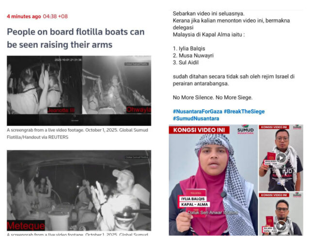 Dua lagi turut ditahan: Sirius bawa 4 aktivis Malaysia dan 1 lagi aktivis negara kita di atas Huga, menurut Facebook Sumud Nusantara Official.