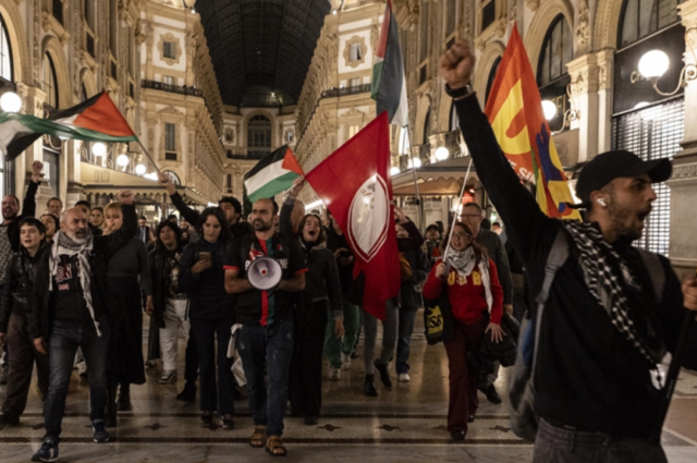 Di Rom, ratusan penunjuk perasaan, termasuk pelajar dan ahli kesatuan sekerja peringkat akar umbi berhimpun di Piazza dei Cinquecento di hadapan Stesen Termini.