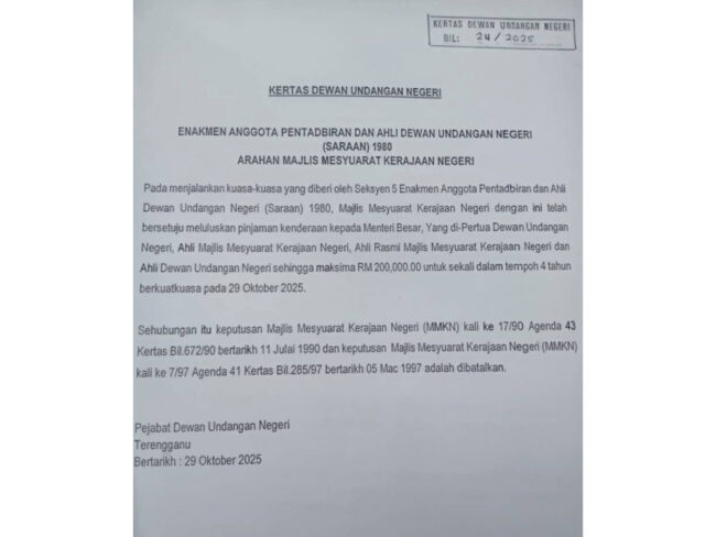 Tular pekeliling pinjaman RM200,000 untuk kereta baru MB, Speaker, Exco, ADUN Terengganu