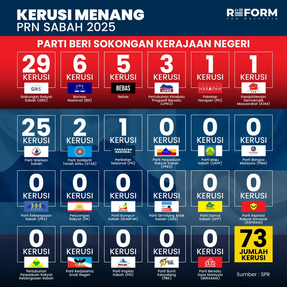 Untuk rekod, Kerajaan Perpaduan Sabah kini dibentuk dengan komposisi melibatkan GRS sebanyak 29 kerusi, BN (6), Bebas (5), UPKO (3), PH dan KDM masing-masing satu kerusi.