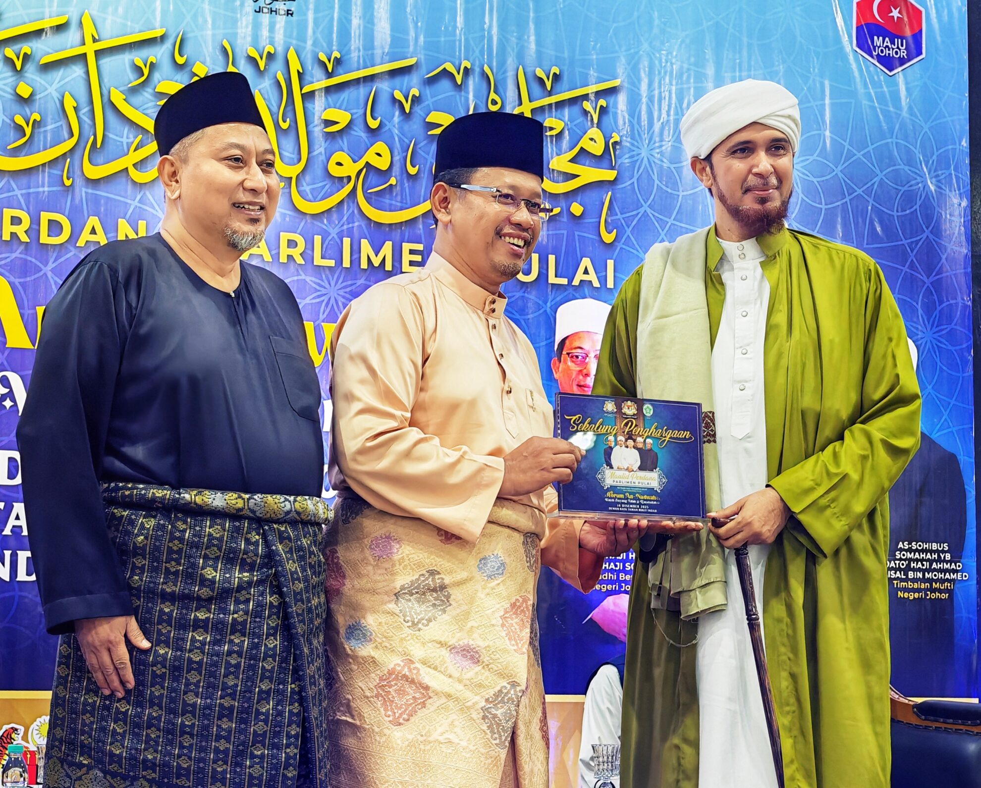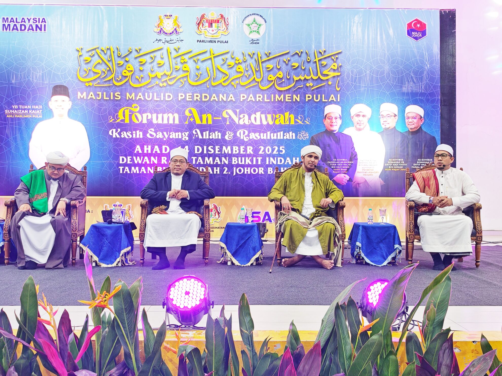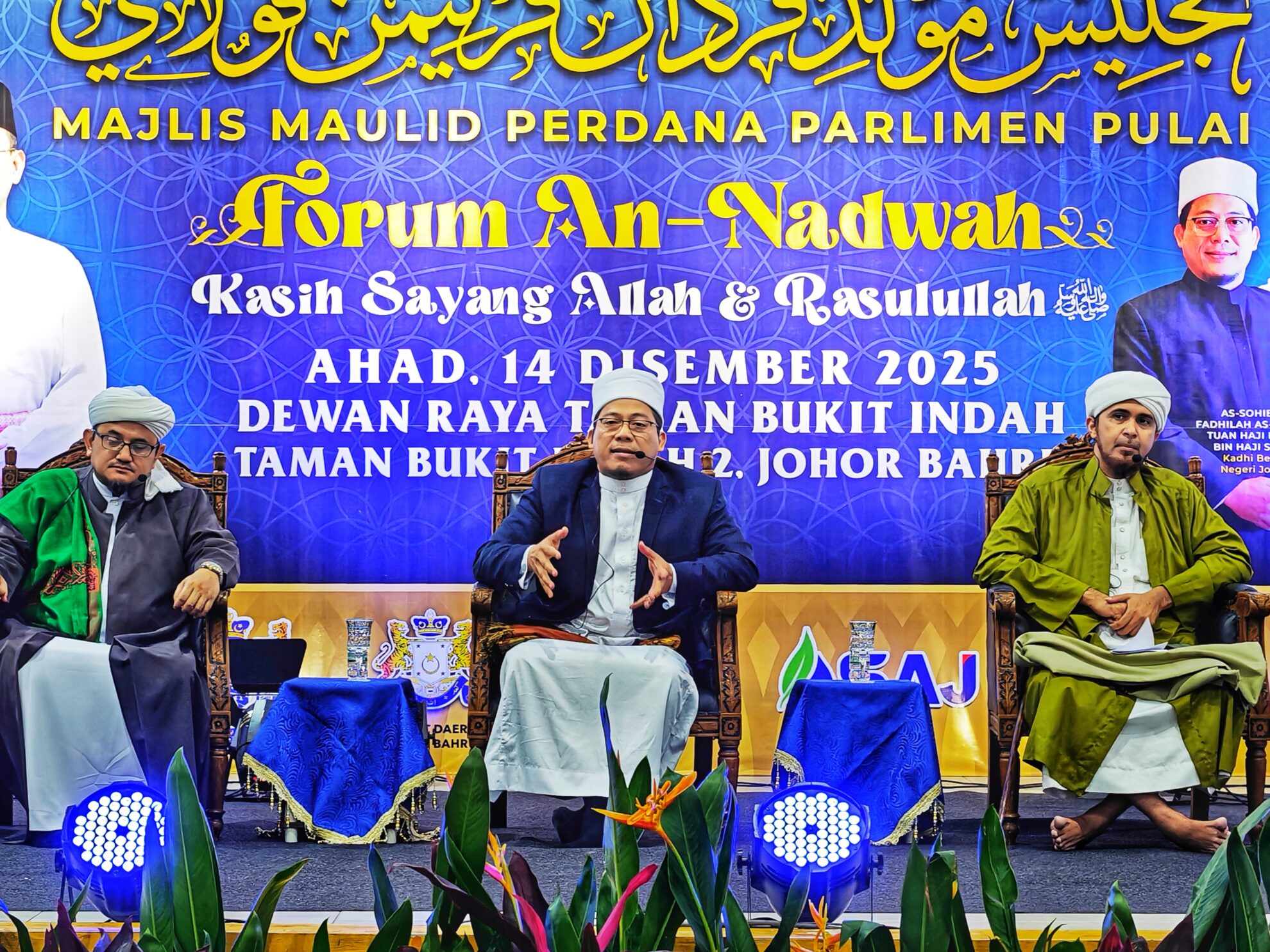 FOTO BERITA: Majlis Forum An-Nadwah – Kasih Sayang Allah & Rasulullah bersama Tuan Hj Halid Hj Sono Kadhi Besar Negeri Johor, Al-Habib Ali Zaenal Abidin Abu Bakar Al-Hamid Penasihat Rabithah Alawiyah Malaysia dan Dato’ Hj Ahmad Faisal Mohamed Timbalan Mufti. Turut hadir YB Tuan Hj Suhaizan Kaiat Ahli Parlimen Pulai di Dewanraya Taman Bukit Indah, Jalan Changkat Indah Utama, Johor Bahru, Johor. 14hb Disember 2025 (Ahad)