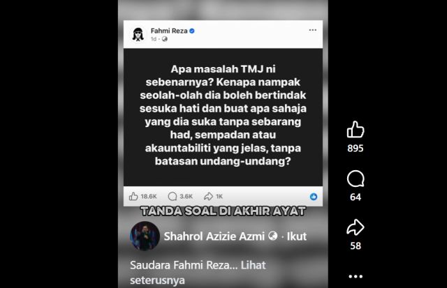 Terdahulu, Fahmi, 48, dihujani kecaman dan berdepan dengan lebih 50 laporan polis terhadapnya gara-gara kenyataan yang disifatkan rakyat Johor sebagai menghasut serta menghina Pemangku Sultan Johor dan institusi Diraja Johor.