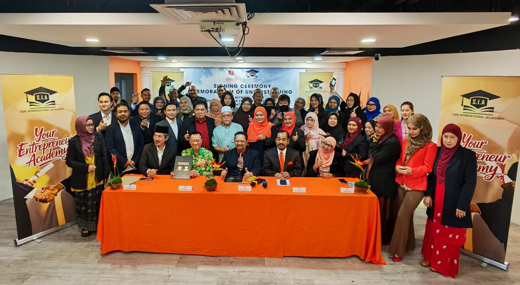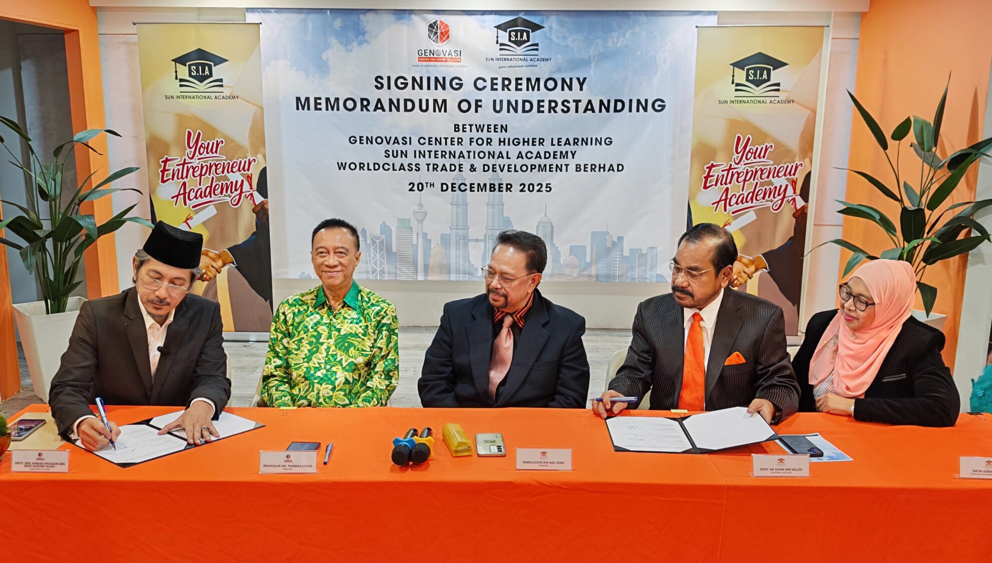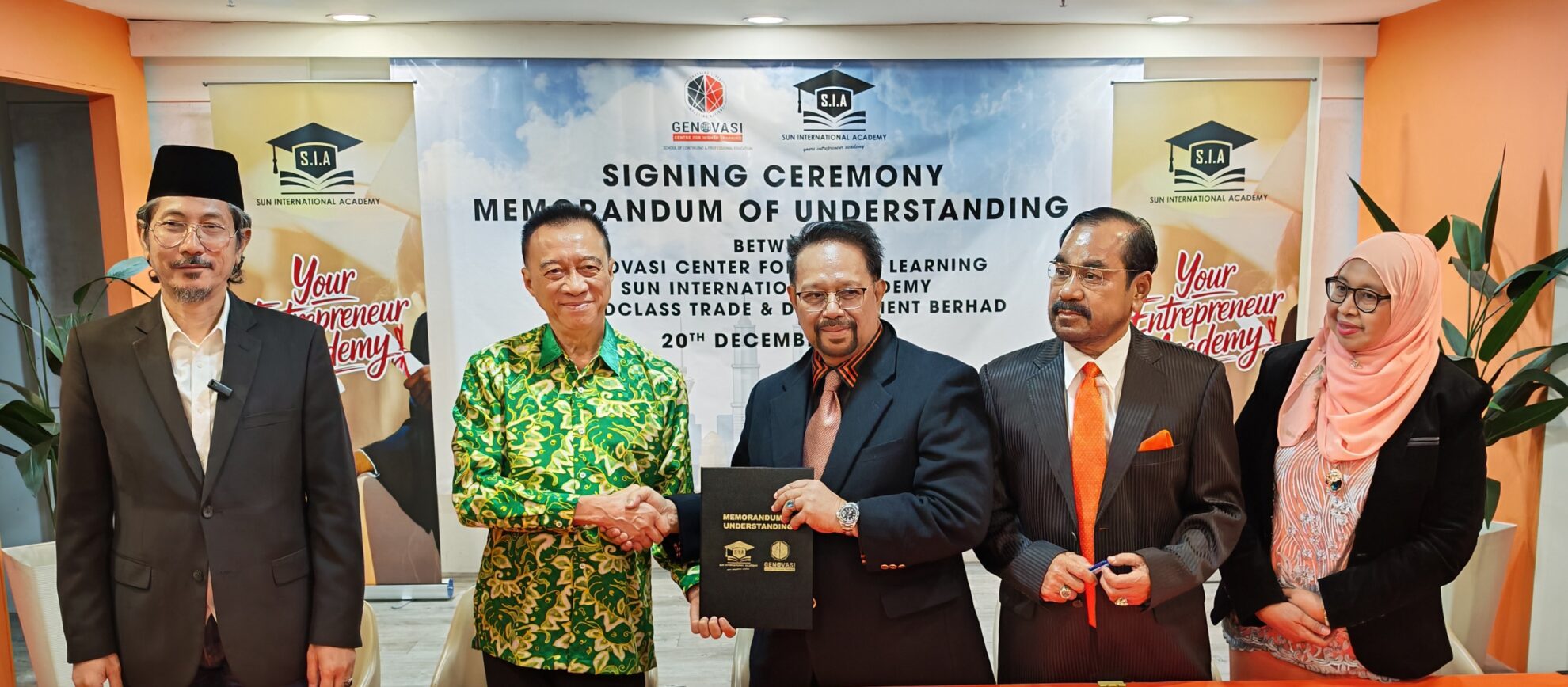 KUALA LUMPUR – Sun International Academy (SIA) memeterai kolaborasi strategik bersama Genovasi Centre for Higher Learning (GCHL) dengan sokongan syarikat bersekutu serta pengendali program, Worldclass Trade & Development Berhad, bagi memperkenalkan Program Profesional Diploma, Ijazah Sarjana Muda dan Sarjana dalam bidang Keusahawanan, Kewangan dan Kepimpinan.