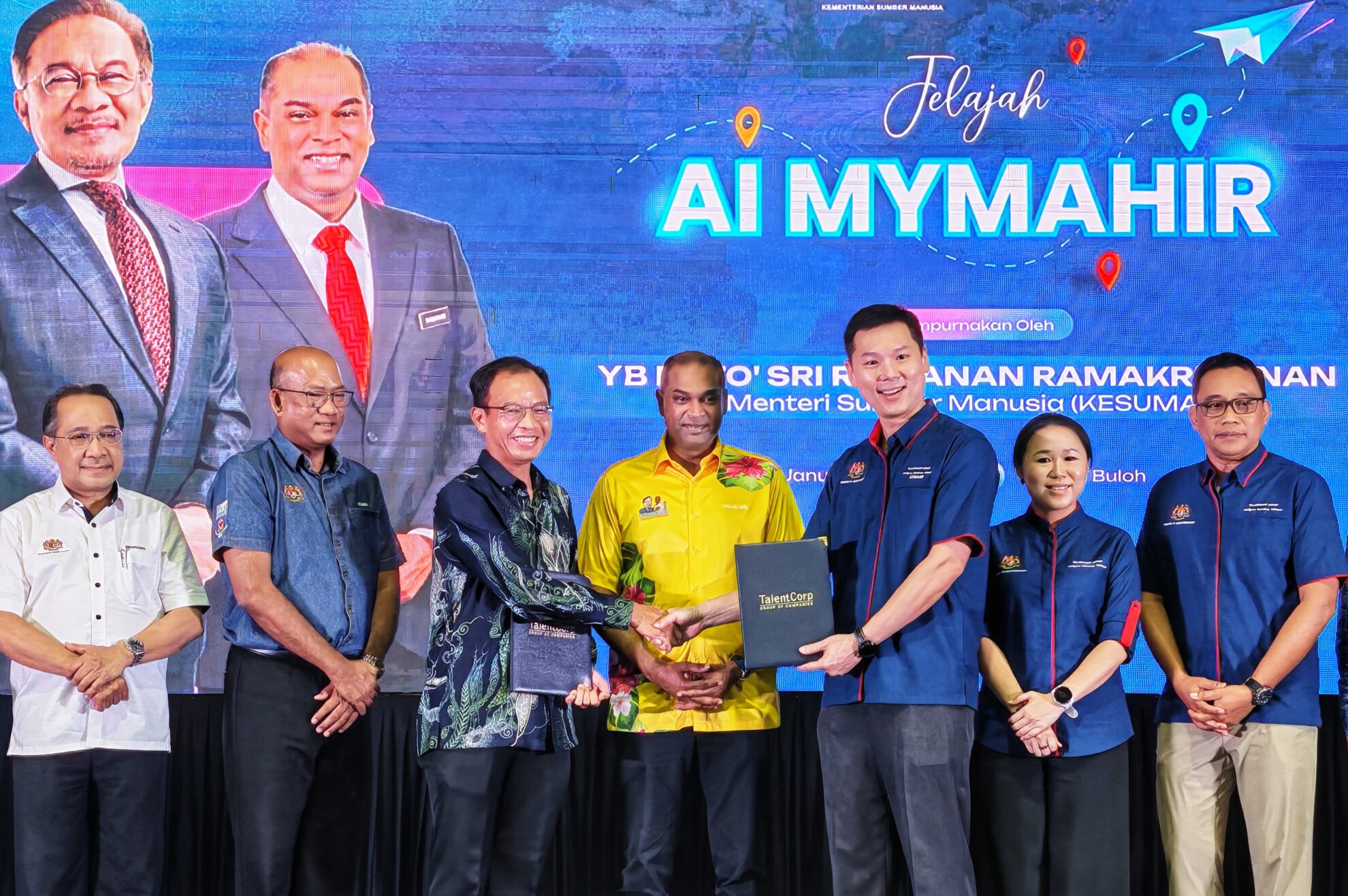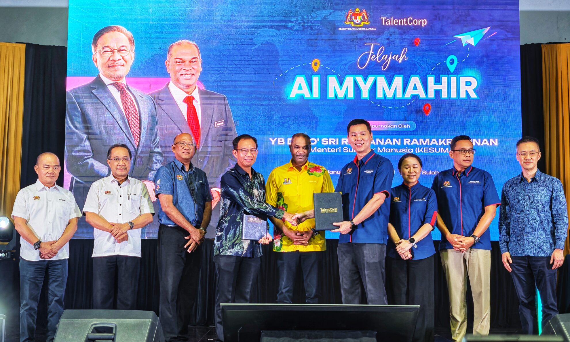 Majlis Pelancaran Jelajah AI MyMahir telah disempurnakan oleh YB Dato’ Sri Ramanan Ramakrishnan, Menteri Sumber Manusia, bertempat di Dewan Meranti, Seksyen U20, Sungai Buloh, hari ini. Program berimpak tinggi ini turut menyaksikan pemeterian Memorandum Persefahaman (MoU) antara Talent Corporation Malaysia (TalentCorp) dan Ernst & Young (EY) Malaysia, sebagai usaha memperkukuh pembangunan bakat dan kemahiran kecerdasan buatan (AI) dalam kalangan rakyat.