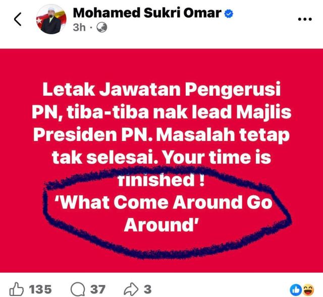 “Masalah tetap tak selesai. Your time is finished! What Come Around Go Around“,” tulisnya di Facebook.