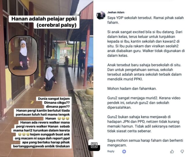 “Si ibu pula rakam dan viralkan seolah-olah anak diabaikan guru. Walker (alat bantuan berjalan) tidak digunakan di dalam kelas.