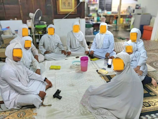 Gambar memaparkan sekumpulan jemaah berjubah dan berselendang putih bersama objek menyerupai sepucuk pistol di hadapan mereka mengundang tanda tanya orang ramai.