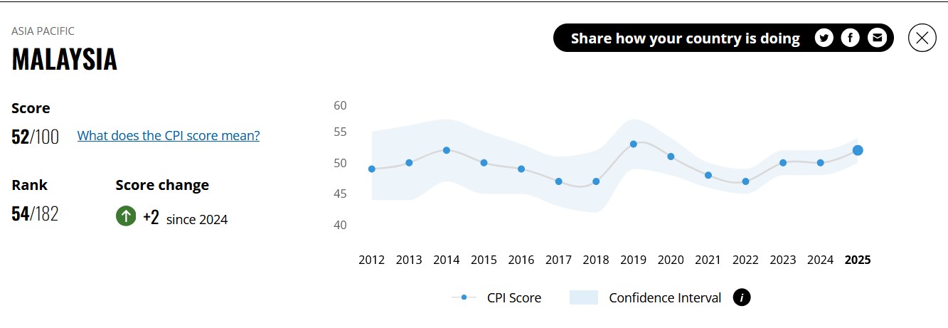 Malaysia has risen three spots in Transparency International’s 2025 Corruption Perception Index (CPI), from the 57th spot to the 54th.