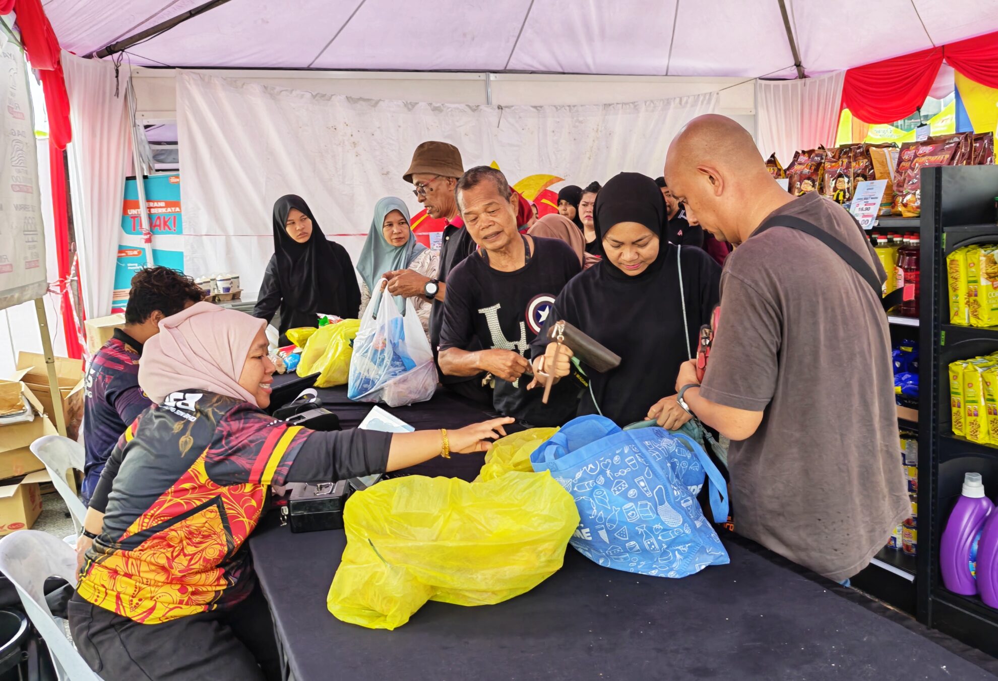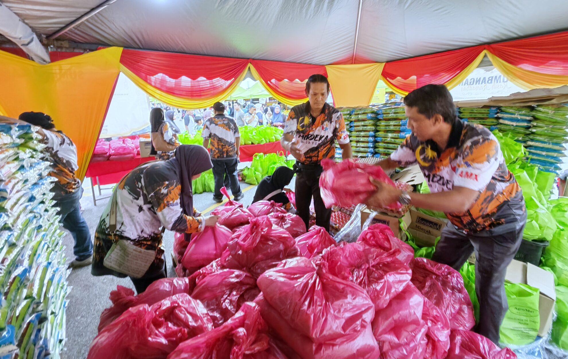 Beliau turut memaklumkan bahawa agihan bakul makanan berlangsung dari jam 9 pagi hingga 1 tengah hari bagi memastikan proses berjalan lancar. Penerima yang mempunyai kupon boleh menebus barangan di dua khemah khas yang disediakan dengan empat kaunter bagi mengelakkan kesesakan dan tolak-menolak.