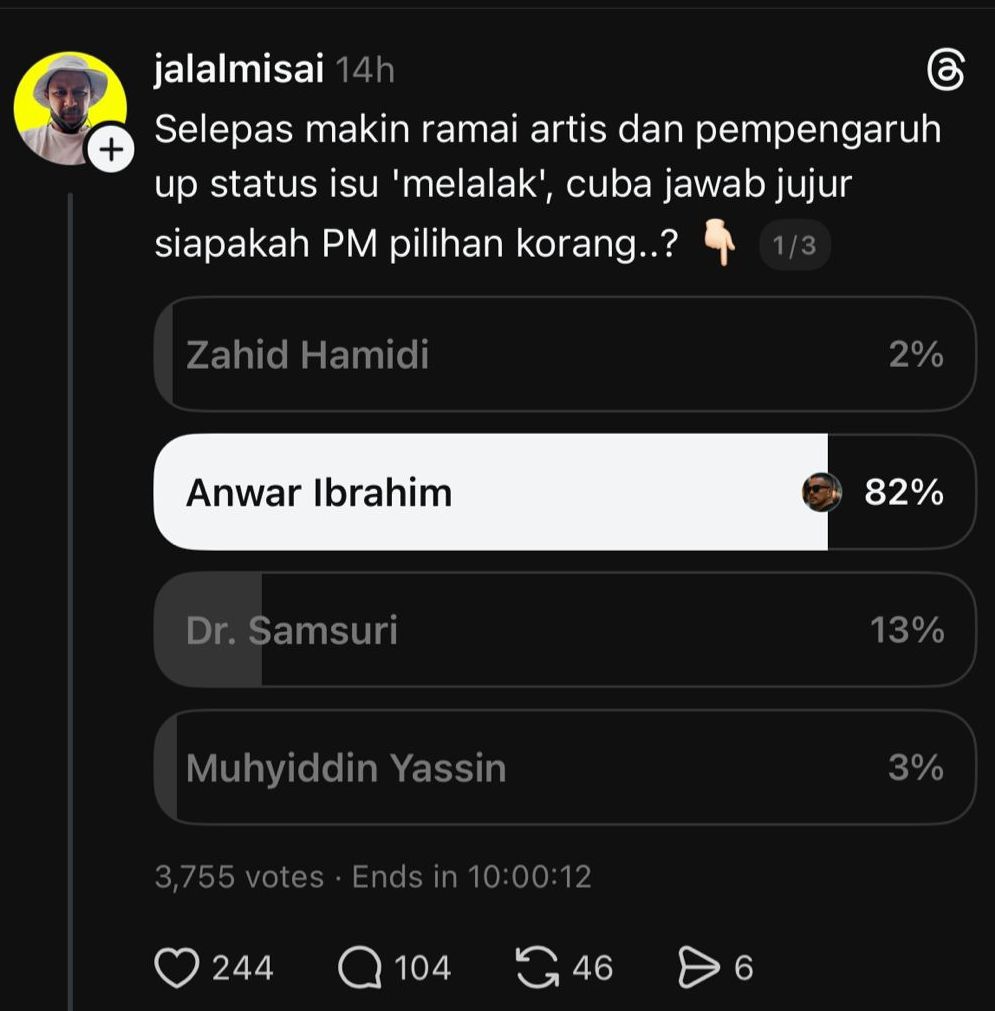 “Selepas makin ramai artis dan pempengaruh up status isu ‘melalak’, cuba jawab jujur siapakah PM pilihan korang…” tanya Jalalmisai dalam posting di platform thread itu yang kini tular.