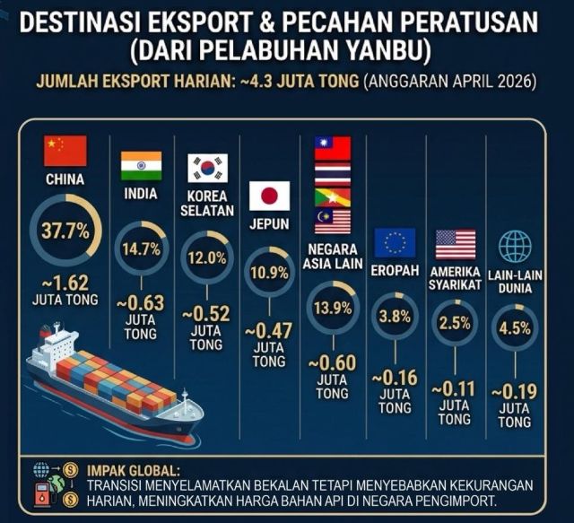 Selepas Perang (April 2026): Menurun kepada sekitar 120,000 – 140,000 tong sehari melalui Yanbu (Laut Merah). Itupun tengah adjust kapal laut lagi ni.