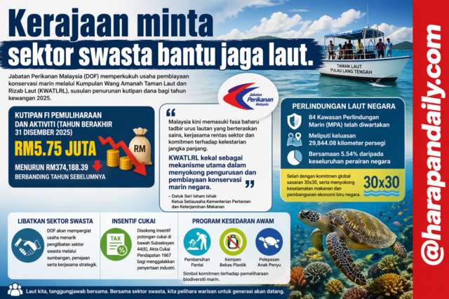 Jabatan Perikanan Malaysia (DOF) memperkukuh usaha pembiayaan konservasi marin melalui Kumpulan Wang Amanah Taman Laut dan Rizab Laut (KWATLRL), susulan penurunan kutipan dana bagi tahun kewangan 2025.