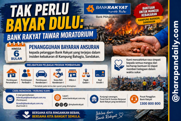Bank Rakyat menawarkan penangguhan bayaran ansuran sehingga enam bulan kepada pelanggan yang terjejas dalam kebakaran di Kampung Bahagia, Sandakan. Dalam kenyataan, bank itu memaklumkan kemudahan tersebut melibatkan pelbagai produk pembiayaan termasuk perumahan, peribadi, kenderaan, sewa beli, mikro, pajak gadai serta kad kredit-i, tertakluk kepada terma dan syarat. Menurut Bank Rakyat, langkah itu merupakan antara usaha … Continue reading Tak perlu bayar dulu: Bank Rakyat tawar moratorium